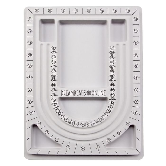 Das Grundelement für jeden Liebhaber der Schmuckherstellung: das Perlenbrett. Es ist mit verschiedenen Größen ausgestattet, so dass Sie Ihre Armbänder und Ketten einfach abmessen können. Es verfügt aber auch über praktische Sortierboxen um Ihr Zubehör auf zu bewahren. Das Perlenbrett dient dazu Ihre Perlen und Charms so auszulegen bis Sie das gewünschte Design erreicht haben.