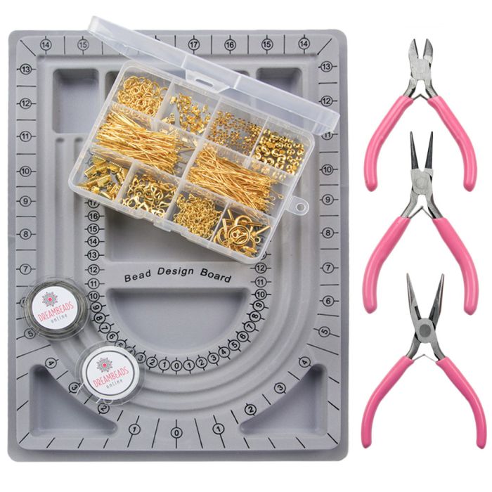 Schmuck Bastelset in Gold zur Schmuckherstellung. Mit einem Schmuck Bastelset können Sie schönen Schmuck ganz einfach selbst zusammenstellen. Dieses XL-Schmuck Bastelset enthält wichtiges Zubehör wie ein Zangenset, ein Perlenbrett und goldfarbene Schmuck Zubehörteile. Ein Schmuck Bastelset ist ideal, wenn Sie gerade erst mit der Schmuckherstellung beginnen. Die Zubehörteile bestehen aus allergiefreiem Metall und haben ein hervorragende Preis-Leistungs-Verhältnis.
