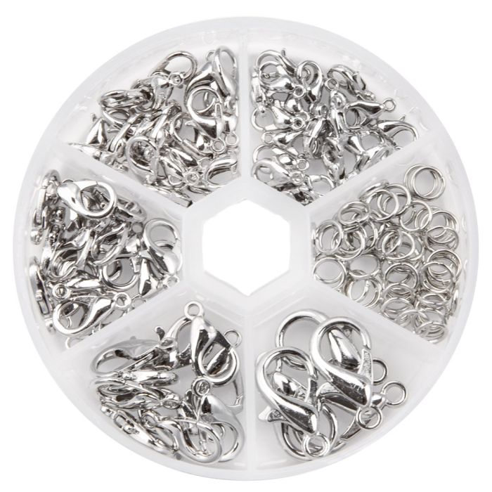 Sortierkasten - Karabinerverschlüsse mit Ösen (10 - 20 x 6 - 11 mm) Altsilber (120 Stück)